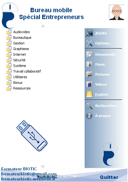 Le Bureau mobile est une compilation de près de 70 logiciels ne nécessitant pas d'installation sur le disque dur d'un ordinateur. Les logiciels incluant dans cette compilation sont divers : AudioVideo, Bureautique, Gestion, Graphisme, Internet, Système, Sécurité, Travail collaboratif, Utilitaires. Ils sont tous gratuits, y compris pour un usage commercial.